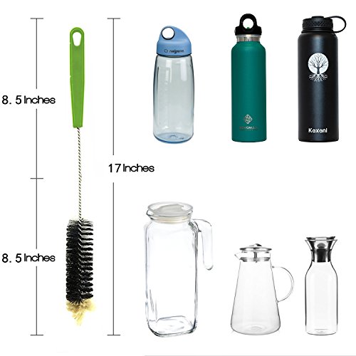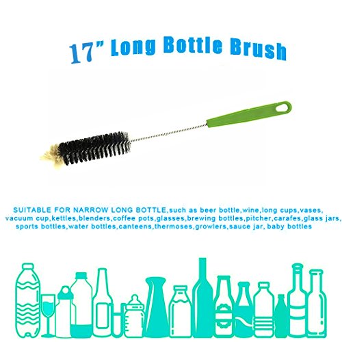- FLEXIBLE AND LONG : The brush head is FLEXIBLE (not stiff) and extra LONG at 17" and 1.5" wide. Makes it easy to reach all sides of the bottle with less effort. You can clean Swell, plastic, bird feeders and other bottles, jars, carboys and anything with small tight openings.