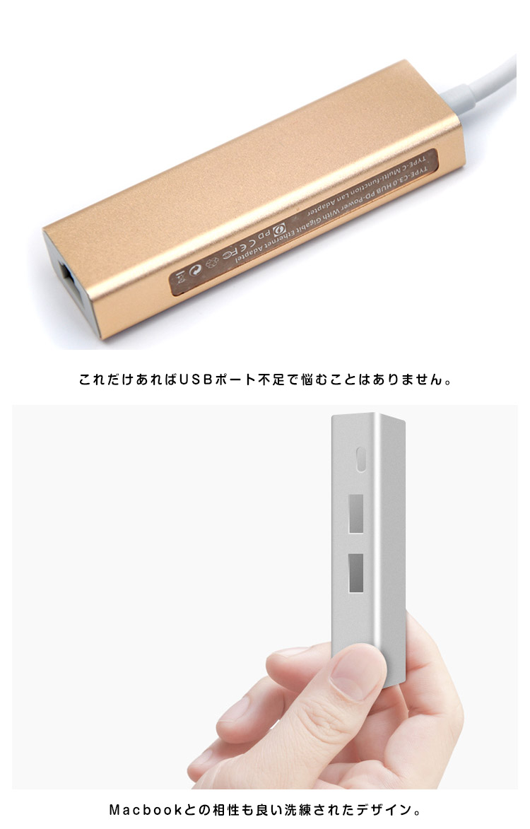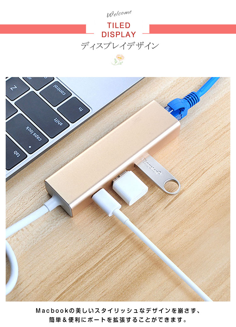 | MacbookなどUSBType-Cポートを搭載したパソコンに接続するだけでType-C充電、USBポートを増設することができる3-in-1USBハブ。スタイリッシュなアルミボディでMacbookとも相性抜群。Macbookの美しいスタイリッシュなデザインを崩さず、簡単&便利にポートを拡張することができます。充電用のType-C USBポートを搭載しているので、パソコンのバッテリー残量を気にすることなく常にフルパワーで作業することができます。 | |
