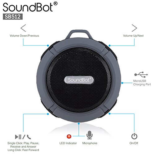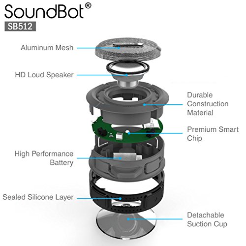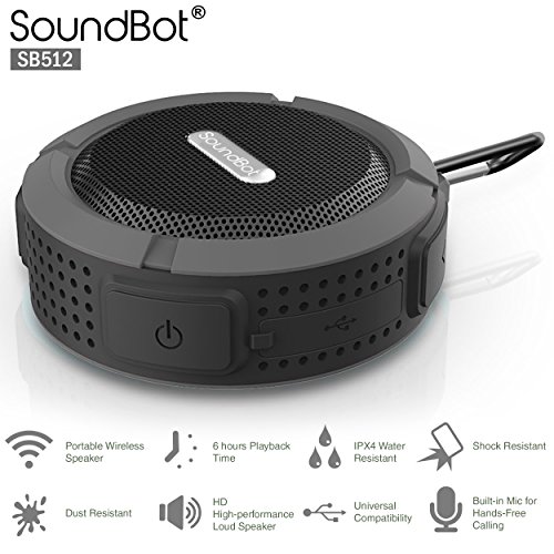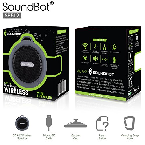 Feature -Shock & water resistant high-performance loud speaker -Premium speaker driver to deliver enhanced music listening experience with HD acoustic and crystal clear sound -Low energy consumption and eco-friendly Bluetooth wireless technology -Reinforced rugged shock-resistance material -High efficiency audio wireless connectivity -Up to 6 hours of playtime, 6.5 days of standby time, or 7 hours of talktime -Universal compatibility with Android and iPhone, iPad, tablets, smartphones, iPods, MP3, MP4 and other Bluetooth enabled digital players -Comes with a built-in hook and a FREE camping snap hook for outdoor use with maximum portability -Built-in mic for hands-free talking -Built-in high density battery Specification -Bluetooth 3.0 + EDR -Playback time: Up to 6 hours - Charging time: 2-4 hour - Connection range: 33 feet - Battery: 500mAh lithium battery - Waterproof level: iPX4 Warranty & support - Email between 9am - 6pm PST will be answered with 24 business hours - 1 year full manufacture product warranty included What's in the box - SB512 HD Water Resistant Bluetooth Speaker - MicroUSB Charging Cable - Camping Snap Hook - Suction Cup - User Guide