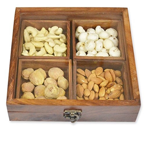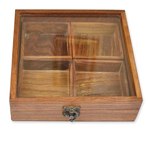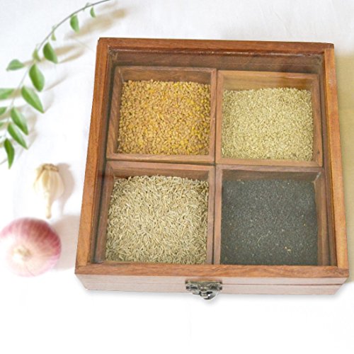 -. Feature : Spice Box Material: Sheesham Wood spice box container and glass lid. / Spice Box Size: Length: 8 inches, Breadth: 8 inches, Height: 2.0-2.25 inches(approx) / Quantity: 1 wooden spice Box with 4 containers and with 1 spoon / Do not expose directly to water. Just wipe out with soft cloth piece. / Spice Box Style: Antique, Decor, Ethnic, Contemporary, Handcrafted, Unique, Casual, Elegant, Lightweight, Eco-friendly, Kitchenware