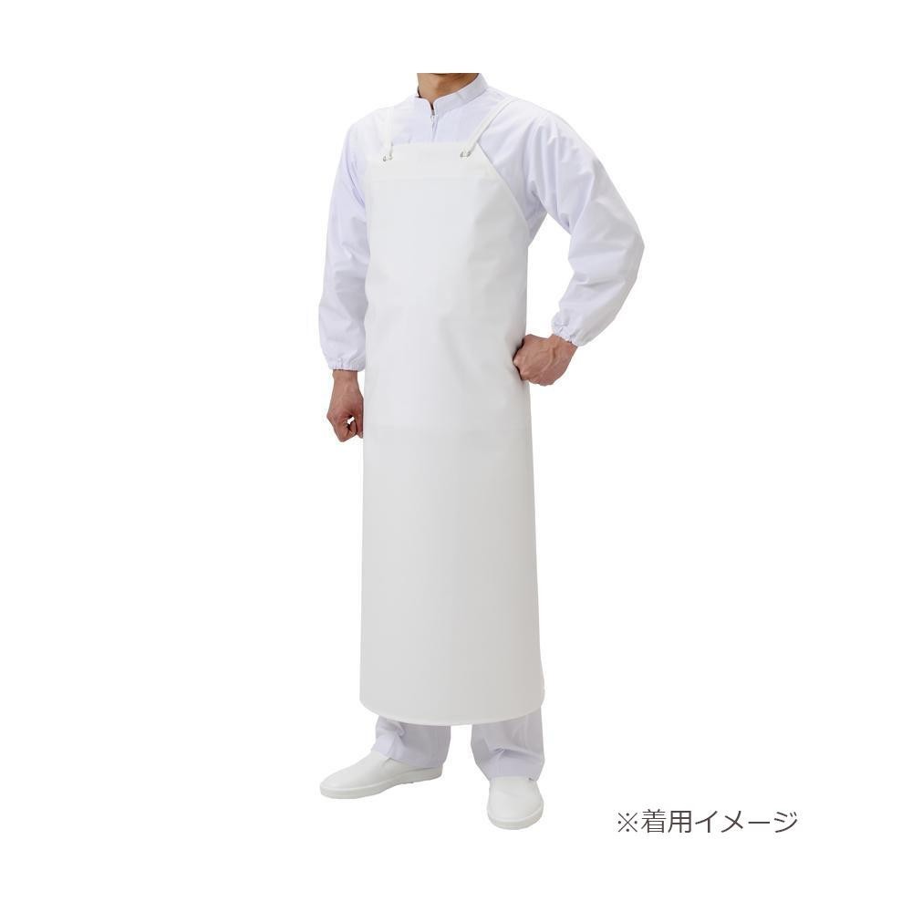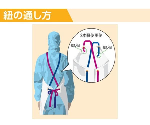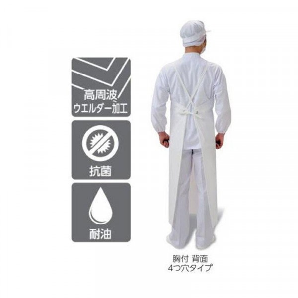 抗菌剤配合の素材を使用した前掛。専用の機械によって加工されており、縫目(ミシン目)のない作りになっています。縫目への汚れ溜まりやミシン糸のほつれがなく食品製造などに最適です。 |