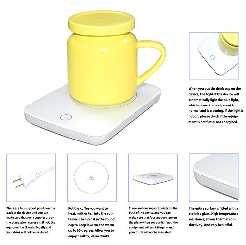 The low-energy constant temperature control system keeps your drink at just the right temperature. By using micro induction to control temperature the warming cup is convenient and uses very little energy. Use the internal heat insulation system's thermostat heater, temperature of the shell is lower than normal, so can touch it. The temperature is always just right We effectively cut out the middle man by selling directly to you Specification product mix:Annular heating ring;Alloy heat transfer cup bottom;power light;Micro gravity induction switch Cup Heater --- Measures: 5.88"x 4.56"x 0.72" Mug --- Lid diameter: 3.11" Mug diameter: 2.65"; Base diameter: 2.74"; Height: 3.76" Rated power: 15W Cup Heater Material: durable plstic Mug Material: ceramics Weight: 11.8ounces Dimensions: 7* 7* 5 inches Package Includes: OKCafe Heater *1 OKCafe Mug *1