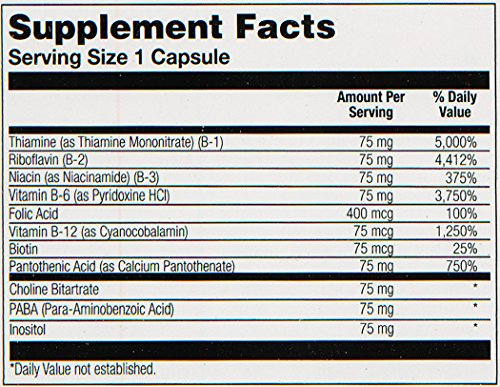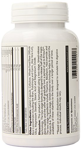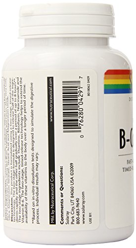 -. Binding : Health and Beauty -. Brand : Solaray -. EAN : 0076280042917 -. Feature : Two-stage ingredients are designed so that half are intended to be rapidly released while the other half are intended to be gradually released over 6-8 hours / Helps to extend the availability of these B-vitamins to the body over a longer period of time / B vitamins promote hearth health, proper circulation and increased levels of energy -. IsAdultProduct : 0 -. Label : Solaray -. Manufacturer : Solaray -. Model : 076280042917 -. MPN : 076280042917 -. NumberOfItems : 1 -. PackageQuantity : 1 -. PartNumber : 076280042917 -. ProductGroup : Health and Beauty -. ProductTypeName : HEALTH_PERSONAL_CARE -. PublicationDate : 2014-10-04 -. Publisher : Solaray -. ReleaseDate : 2015-03-19 -. Size : 100 -. Studio : Solaray -. Title : Solaray B Complex Two Stage Time Released Supplement, 75mg, 100 Count -. UPC : 076280042917