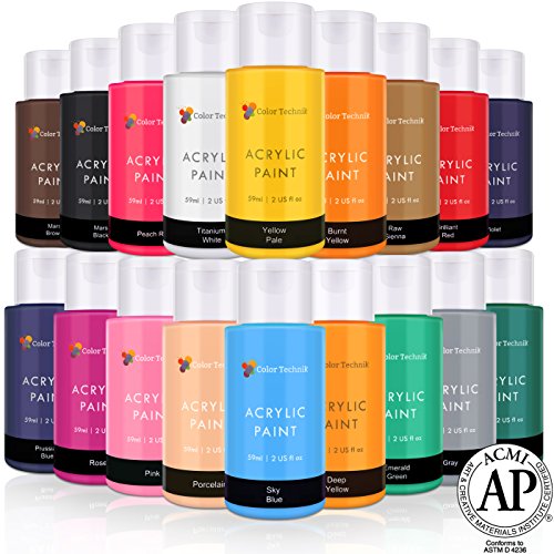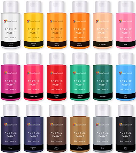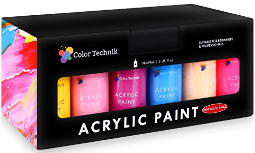 Acrylic Paint Set By Color Technik, Artist Quality, NEW COLORS, 18x59ml (2-Ounce) Bottles, Best Colors For Painting Canvas, Wood, Clay, Fabric, Nail Art & Ceramic, Rich Pigments, Heavy Body, GIFT BOX