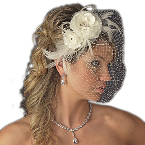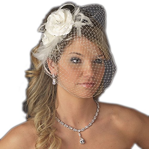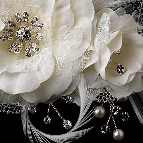 Product Description Beautiful white or ivory double open flower made of lace and matte satin fabric with sparkling crystal centers with pearl and rhinestone sprays and feather accents. Veil and flower are one piece attached to comb for easy securing and placement.