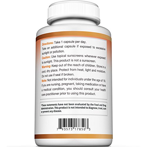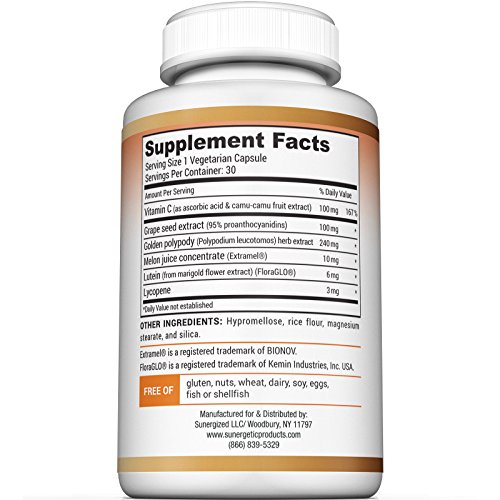 SIX CLINICALLY STUDIED SKIN VITAMINS: Our powerful beauty supplement includes Vitamin C, Camu-Camu, Grape Seed Extract, Polypodium Leucotomos Herb Extract, Lutein (FloraGLO®), Lycopene and Melon Juice Concentrate (Extramel®) that contains high levels of SOD (Superoxide Dismutase). Unlike other acne supplements, antioxidant supplements and collagen capsules, we include the best antioxidants available for skin support.