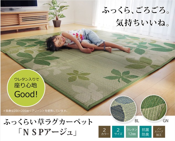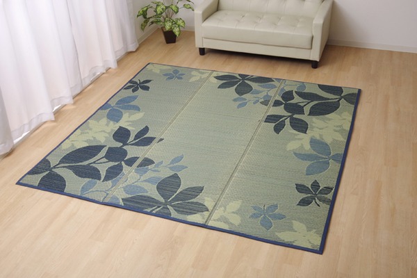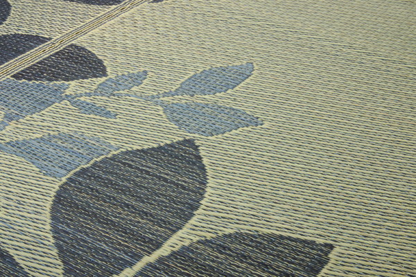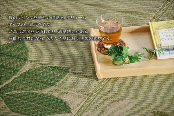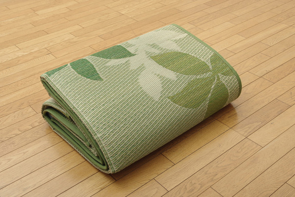 大型商品リーフをデザインしたシンプルでカジュアルない草ラグです。クッション性にこだわり、中材にはウレタンフォームを12mm使用しました。底付き感なく、ふっくらとした踏み心地の商品です。裏面には滑りにくい加工も施しており、フローリングのお部屋には最適です。い草には空気の自然浄化作用、湿度の調節作用などがあります。また汚れにくく、使用するうちに黄金色に変化し、味が出ます。