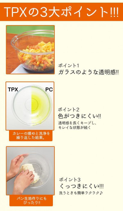 食品の冷凍・解凍・あたために便利なTPX製クリアボウルの3点セット。耐熱・耐冷性が高く、電子レンジや食洗機にも対応しています。またTPXは剥離性が高いので、変色や油汚れにも強くお手入れ楽ちん!!抜群の透明感で、サラダボウルとして食卓にそのまま出してもオシャレです。軽量で注ぎ口付きだから作業性も抜群!!重ねられるので、収納時もすっきり省スペース♪ |