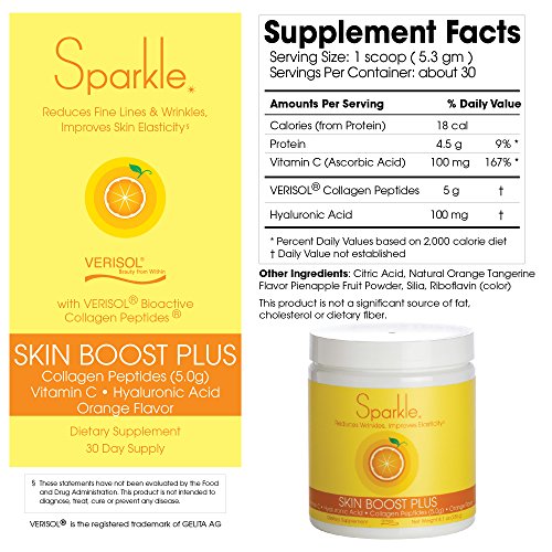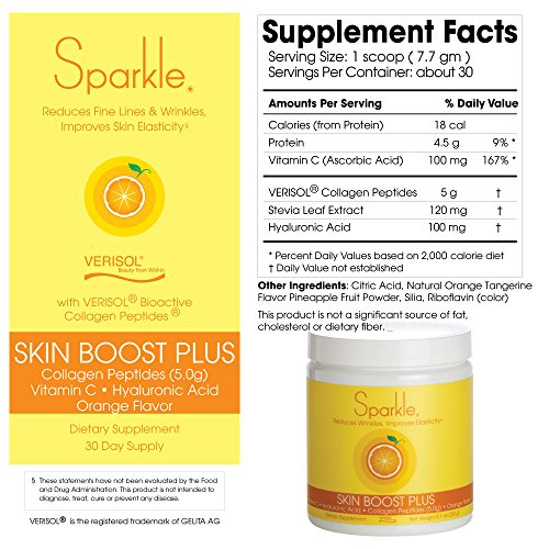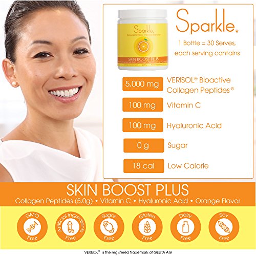 Studio : Sparkle Collagen Publisher : Sparkle Collagen Binding : Health and Beauty Product Description If you like Sparkle Skin Boost, you'll love Sparkle Skin Boost Plus for its added skin benefits in this advanced formula. Compared to Skin Boost, in every serve of Skin Boost Plus, there is twice the amount of VERISOL Bioactive Collagen Peptides, nearly two times the amount of Vitamin C and the addition of Hyaluronic Acid. Sparkle Skin Boost Plus Orange Flavor Powder is easy to prepare. Here are some simple suggestions. Just Add Water: Pour one scoop of Sparkle into a glass of water and stir. Best done with room temperature water, and then chill afterwards by adding ice. Blend in to Smoothies: Sparkle adds a great citrus note to smoothies.Simply add Sparkle to your smoothie preparation before you blend. With Tea: Sparkle's light orange taste complements many teas. Sparkle can be added to hot or cold beverages. Mix one scoop into your cuppa and enjoy! Mix with Yogurt: Sparkle can be added to food too! To add Sparkle to your yogurt, add one scoop, then mix well. Then add the yogurt to your morning bowl. 0