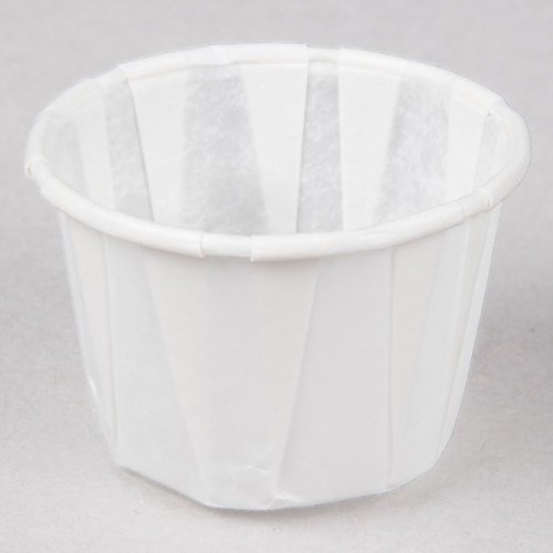 Product Description This 1 oz. Paper Souffle Medicine Cup is a great product for portioning in a restaurant setting. It perfectly measures out a single ounce of any sauce, condiment, salad dressing, or topping that your customers wish to have served on the side of their meal. Its folded paper design and rolled edge will look nice along side your delicious food while securely holding its contents. This is also a terrific baking cup for miniature muffins or cupcakes and to serve samples to customers. This multi-purpose paper product is sold 5000 per case. 0