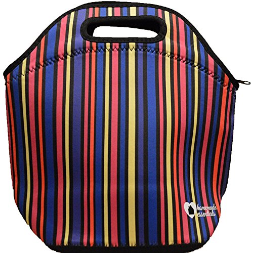 Reusable and Portable Neoprene Lunch Tote with Heavy Duty Zipper for Both Men and Women - Bag Designed to Stretch for Big Healthy Meals on the Go (Stripes)