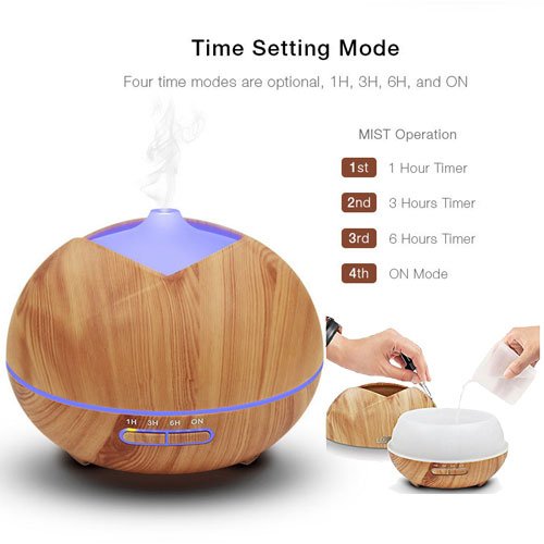 - Wood grained diffuser 450ml : This aroma diffuser is coated with wood grain, which makes it look very natural and primitive. 4 time setting modes: 1H/ 3H/ 6H/ ON/OFF. Diffuser automatically powers off when water level is too low. Add water and essential oil, enjoy high-quality life