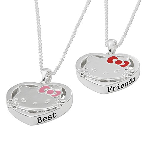 Show your love for Hello Kitty with these classic breakaway friendship necklaces!Official Licensed Hello Kitty Silver Plated Brass Heart BFF two piece Pendants necklaces are made of gleaming brass and hang from an 18 inch chain with a spring ring clasp. This fashion necklace comes gift boxed making for a perfect gift for any woman including your daughter, sister, granddaughter, niece or any loved one.Feature