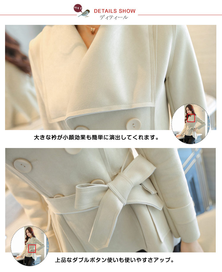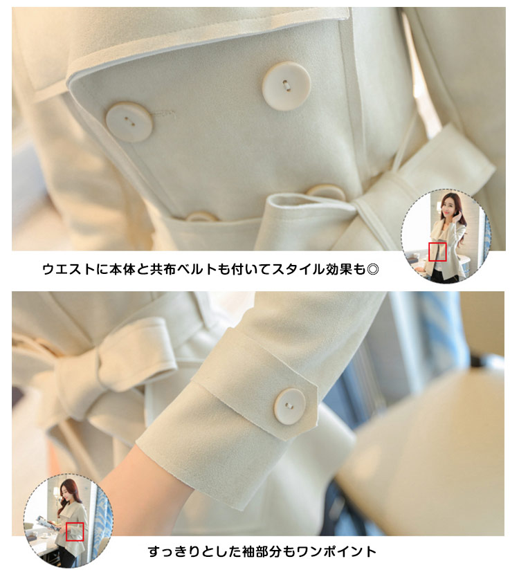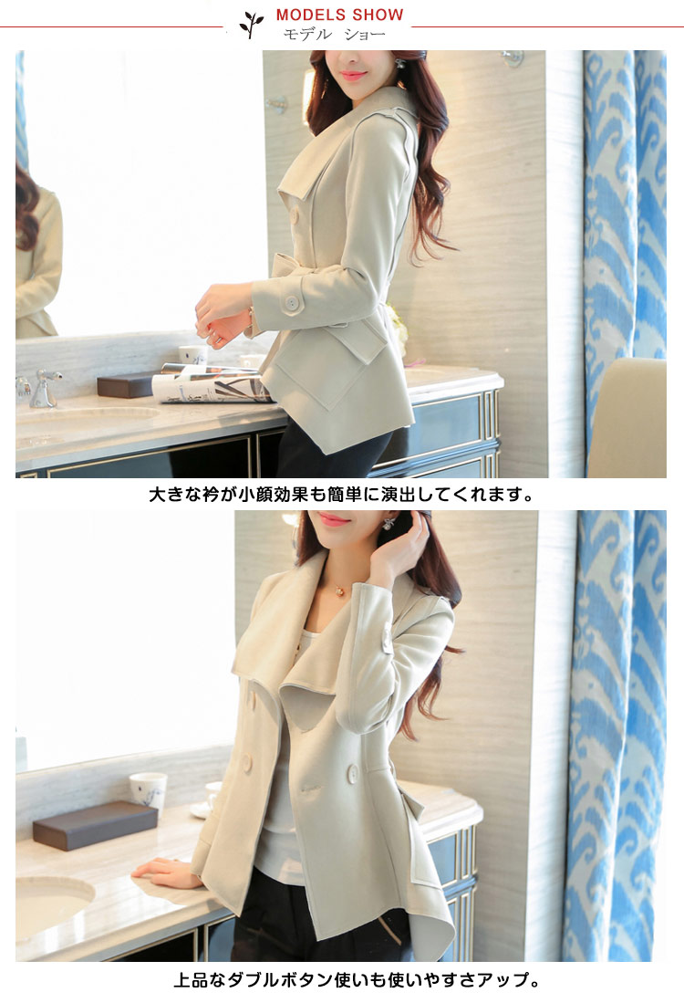 | ワイドパンツやボリュームボトムと好相性のショート丈のトレンチコート。大きな衿が小顔効果も簡単に演出してくれます。上品なダブルボタン使いも使いやすさアップ。ウエストくびれたデザインになって、女性らしいシルエットにさらに本体と共布ベルトも付いてスタイル効果も◎合わせやすい着丈で、スカートやパンツなどあらゆるボトムスと好相性です。目線を上に散らしてスタイルアップ効果が狙える優秀アウターです。 | |
