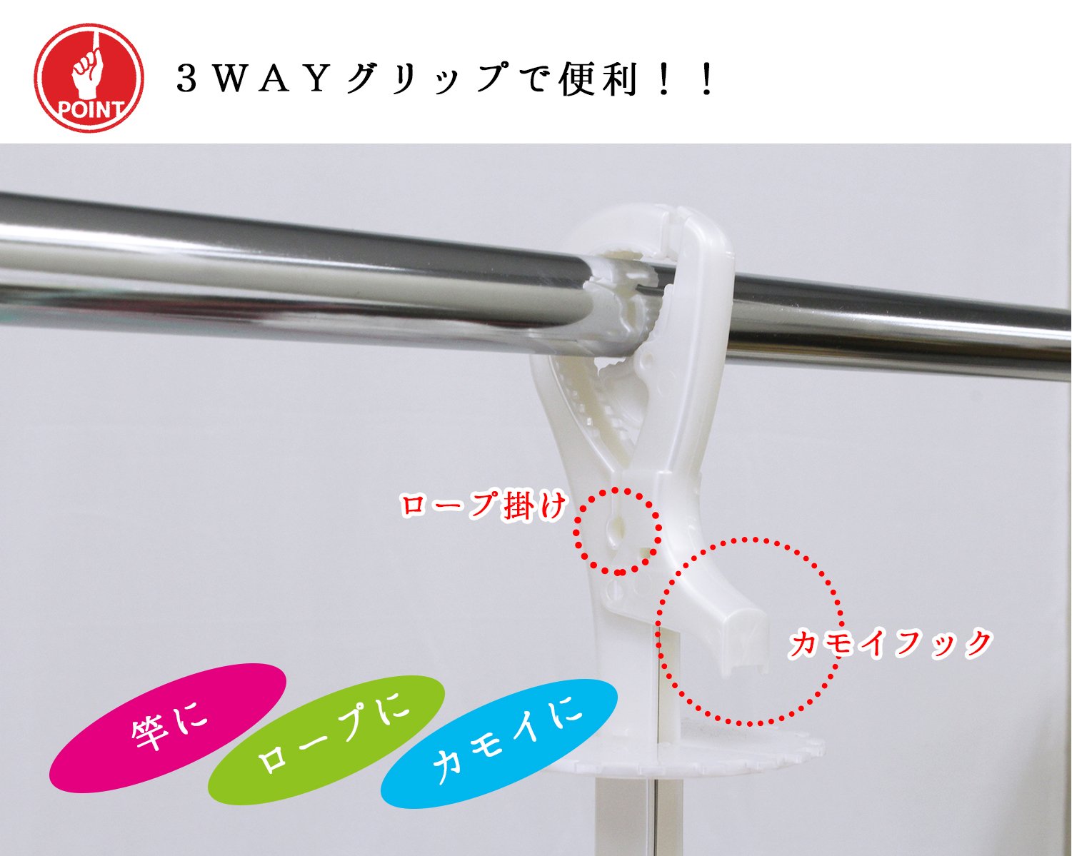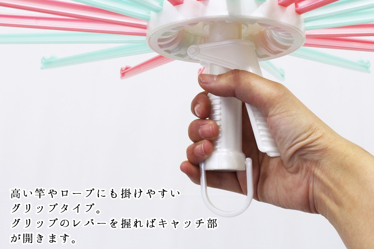 - A grip type that can be easily hung on high rods and ropes.