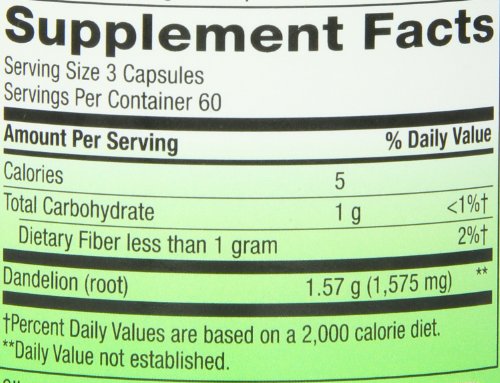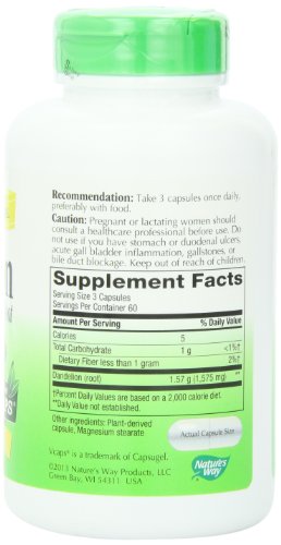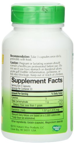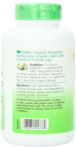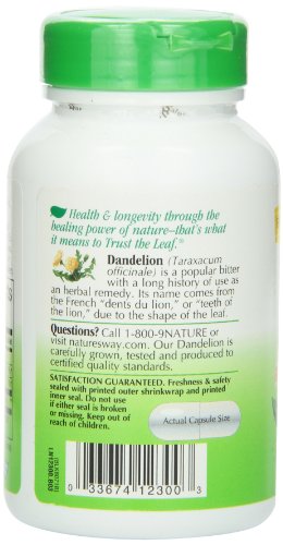 -. Binding : Health and Beauty -. Brand : Nature's Way -. Feature : 2 Bottles of Vcaps / Dandelion is a popular bitter with a long history of use as an herbal remedy. / Dandelion's name comes from the French "dents du lion," or "teeth of the lion," due to the shape of the leaf. / Nature's Way dandelion root is imported from Europe -. Label : NATURE'S WAY -. Manufacturer : NATURE'S WAY -. PackageQuantity : 1 -. ProductGroup : Health and Beauty -. ProductTypeName : HEALTH_PERSONAL_CARE -. Publisher : NATURE'S WAY -. Studio : NATURE'S WAY -. Title : Dandelion Root
