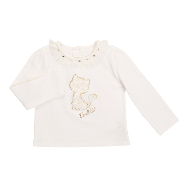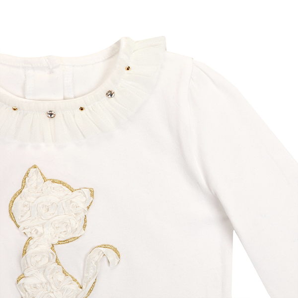 상세설명-목선에 프릴이있어 예쁘며 캣 모양이 장미코사지로 장식되어 더욱더 예쁜 티셔츠입니다