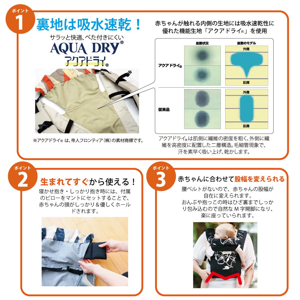 Also, when wearing a piggyback or hanging around, you can wrap around the knees firmly and become a natural M-shaped leg, so you can maintain a comfortable posture for your baby.