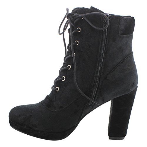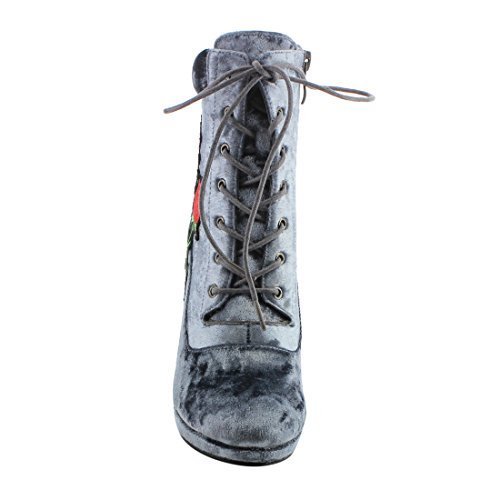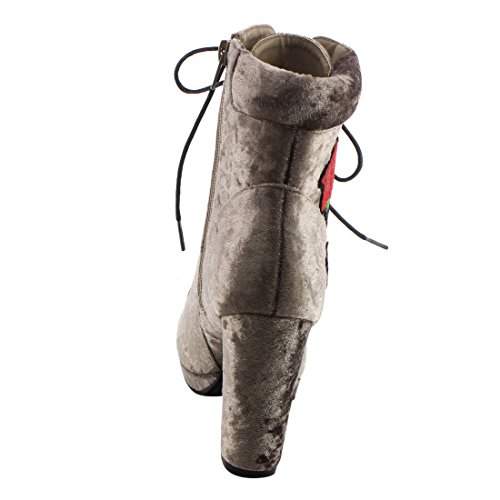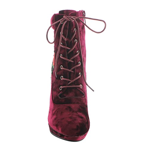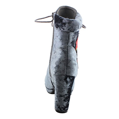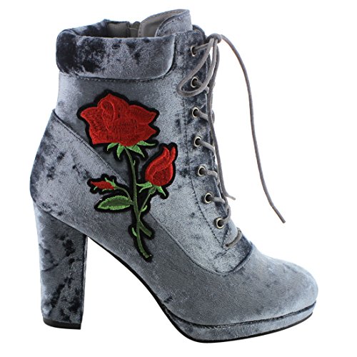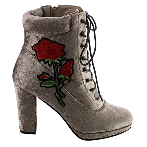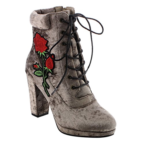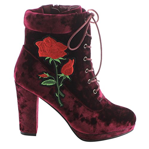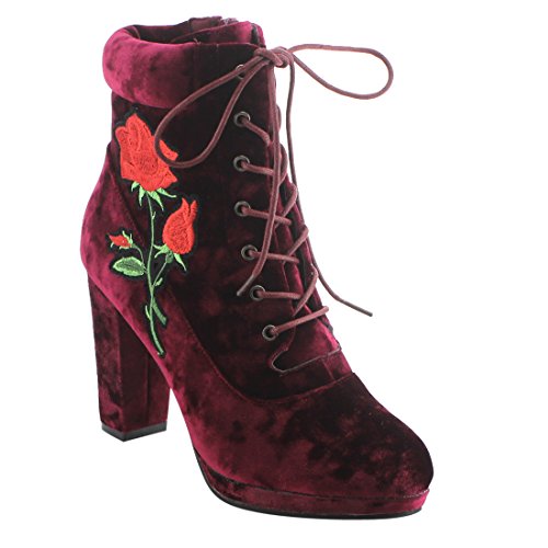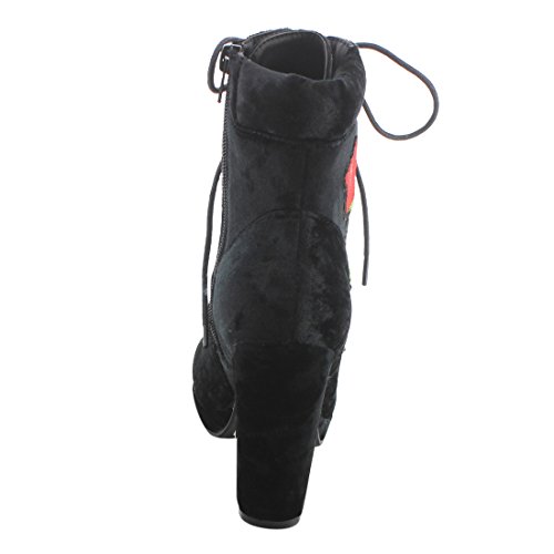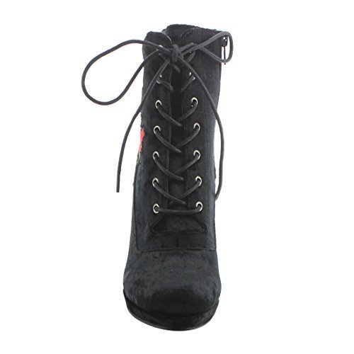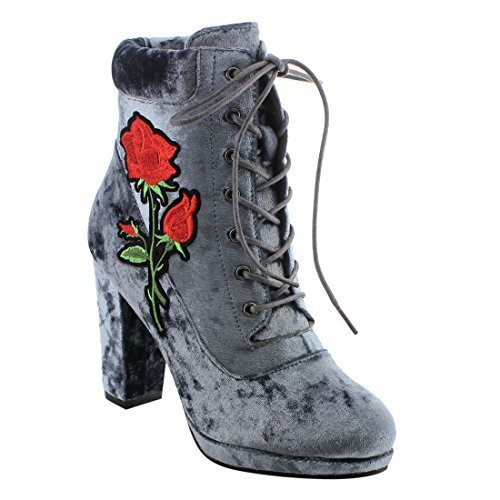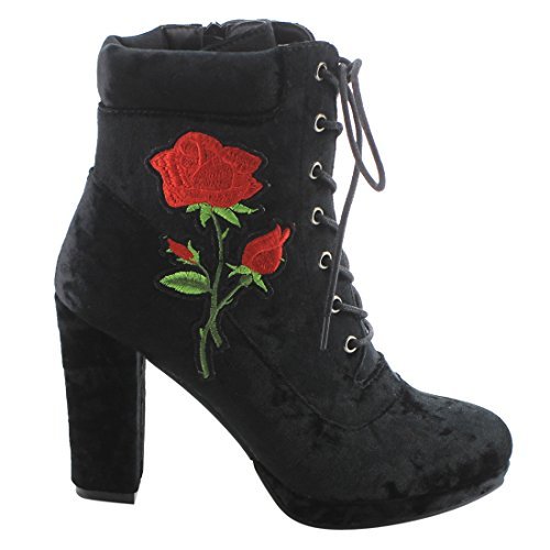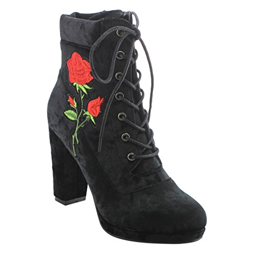 Product Description Step into sleek seasonal style with these ankle booties.Design with a elaborate stitched floral accent,functional side zipper for easy entry,front lace up closure,padded velvet collar,covered block heel and smooth lining. 0