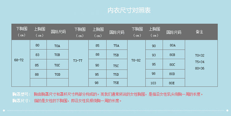 宝贝尺码:32/70ABC、34/75ABC、36/80 ABC 、