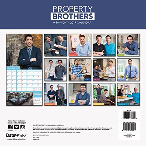 -. Binding : Office Product -. Brand : Trends International -. EAN : 0057668875860 -. Feature : 2017 Calendar featuring beautiful full color photographed images for every month of the year. / Includes Holidays and Observances. / Keep your appointments and Birthdays organized in one place! / Perfect for office spaces, bedrooms, classrooms and more! / Makes a great gift for friends and family! -. Label : Trends International -. Manufacturer : Trends International -. MPN : 875086 -. NumberOfItems : 1 -. PackageQuantity : 1 -. PartNumber : 875086 -. ProductGroup : Office Product -. ProductTypeName : OFFICE_PRODUCTS -. Publisher : Trends International -. Studio : Trends International -. Title : 2017 Property Brothers Calendar - 12 X 12 Wall Calendar -. UPC : 057668875860