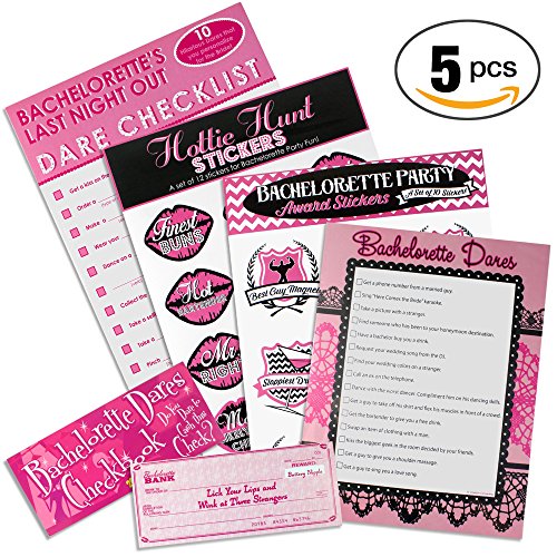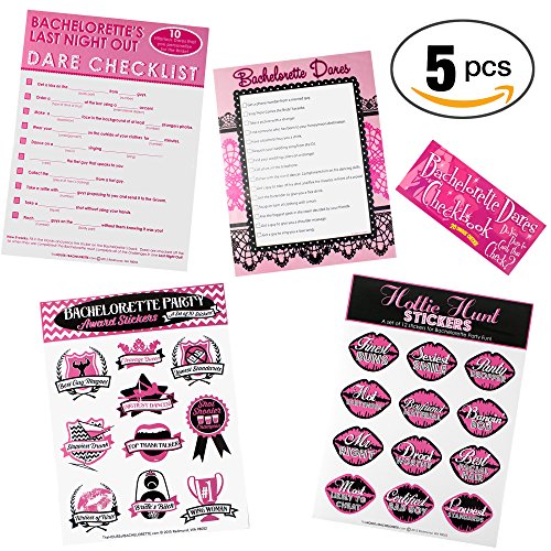 - 5 PIECE BACHELORETTE PARTY GAME KIT: This kit includes 1 Last Night Out Dare Checklist Sticker, 1 Bachelorette Dare Sheet, 1 Sheet of Hottie Hunt Stickers (Set of 12 stickers), 1Sheet Bachelorette Award Stickers (Set of 10 stickers), 1 Bachelorette Dares Checkbook (20 Different Checks)