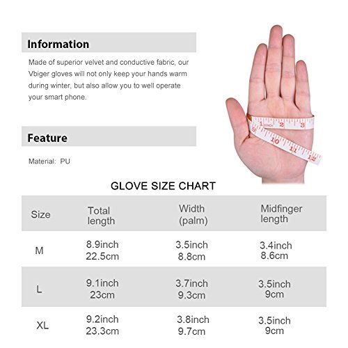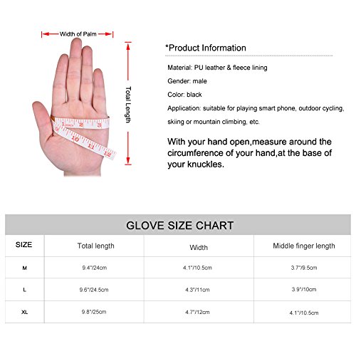 Information Vbiger Men PU Leather Touch Screen Gloves- High-end and fashionable, perfectly shows your good taste! Made of superior PU leather with brushed lining, our Vbiger gloves will not only keep your hands warm during winter, but also allow you to well operate your smart phone. If you want to know more details or have any questions, please look through the detailed page or contact the customer service. Feature Material: PU leather fleece lining Size: (M) total length 9.4"/24cm; width (palm) 4.1"/10.5cm; midfinger length 3.7"/9.5cm (L) total length 9.6"/24.5cm; width (palm) 4.3"/11cm; midfinger length 3.9"/10cm (XL) total length 9.8"/25cm; width (palm) 4.7"/12cm; midfinger length 4.1"/10.5cm Gender: Men Color: Black Package list: a pair of gloves Notice * The actual color may vary slightly from the online image due to monitor color settings. * Please allow slight measurement deviation for the data. 0