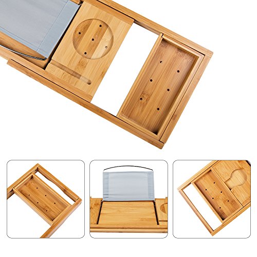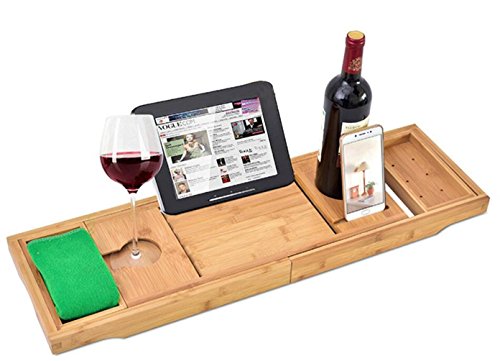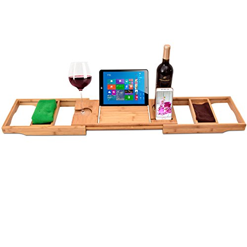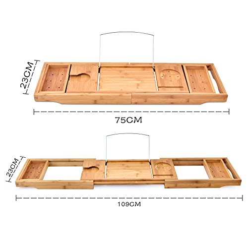 Made of high-quality bamboo with smooth finish.Measures 29.5 inches closed and 43.3 inches fully extended, adjustable to fit most bathtub available on the market.Simply grab your favorite drink and immerse yourself into the hot bath while watching your favorite video or reading your favorite book.