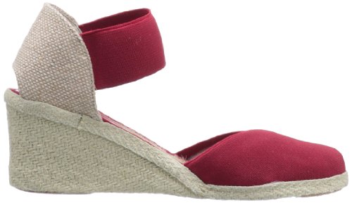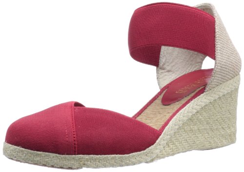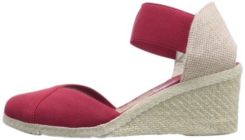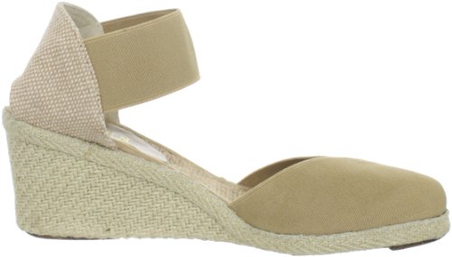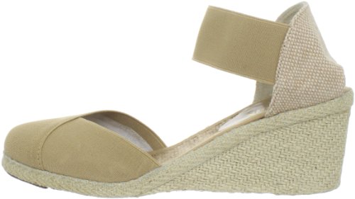Two-piece espadrille featuring closed round toe, wide elastic band at ankle, and jute-wrapped platform wedge