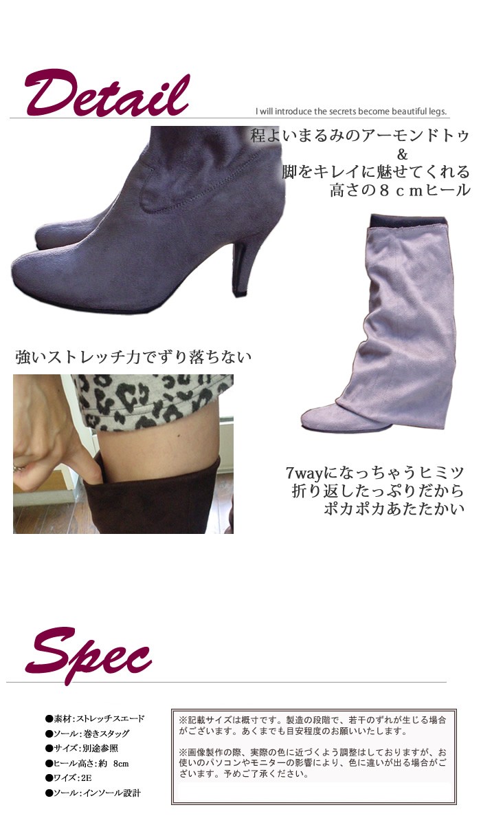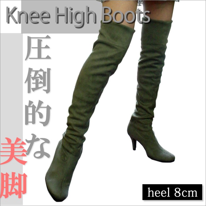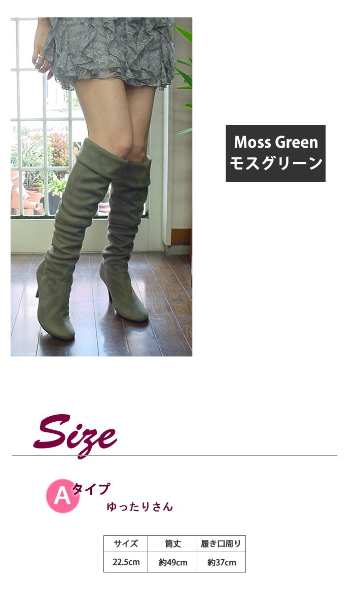※こちらの商品はラストペアの為【訳あり】として特別価格にて販売させていただいております。返品不可となっておりますのでご了承の上購入いただきますようお願い申し上げます。8cmヒールのストレッチニーハイブーツ♪足元ぽっかぽかで秋冬のマストアイテムです【おすすめポイント】◆強いストレッチ力でずり落ちない◆脚を綺麗に魅せてくれる高さの8cmヒール◆程よい丸みのアーモンドトゥ◆美脚効果抜群【仕様】材質:ストレッチスエードカラー:モスグリーンサイズ:Aタイプ(ゆったり):22.5cm