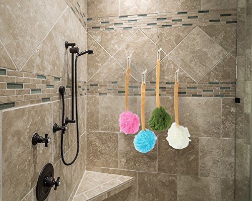 LUXURIOUS BATH POUF SET: Includes 4x Mesh Shower Puffs with Wooden Handles. Comes in appealing colors of White, Green, Blue, and Pink that will add a dynamic touch to your bathroom.