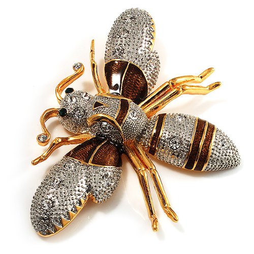 Embrace your playful side with a touch of pretty whimsy in the shape of this art deco style Oversized Gold Diamante Bee Brooch. Featuring an oversized bee design, crafted in gold and silver tone metal and decorated with enamel detailing in hues on light brown. The body and wings embellished with clear crystals. The eyes set with two tiny emerald green crystals. The brooch is about 8.5cm x 5.8cm, and secures with a pin fastening.Feature