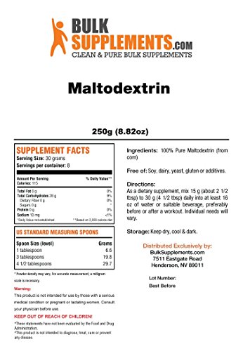 Studio : Bulksupplements Publisher : Bulksupplements Binding : Health and Beauty Product Description Maltodextrin is an easily digestible starch used as a food additive. It is also a popular carbohydrate among bodybuilders and can be added to pre- and post-workout shakes. This particular Maltodextrin is derived from non-GMO corn starch. 0