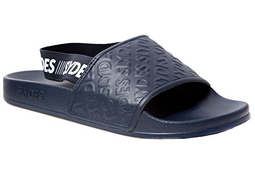 Binding : Apparel Product Description These men's navy slip on slider sandals feature Slydes repeat angular deboss logo upper, with matte and gloss contrast textures. Style includes a flexible but supportive contrast branded elastic heel strap. All Slydes have our renowned quick-drying single-bandage upper, form fitting contoured footbed and textured sole for grip and durability. 0