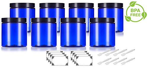 - Includes 8 - 8 oz / 250 ml Cobalt Blue PET BPA Free Plastic Jars + spatulas and labels for each jar for optional use