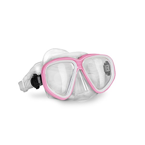 The set includes a mask with a tempered lens, dry snorkel that prevents water from splashing into the tube