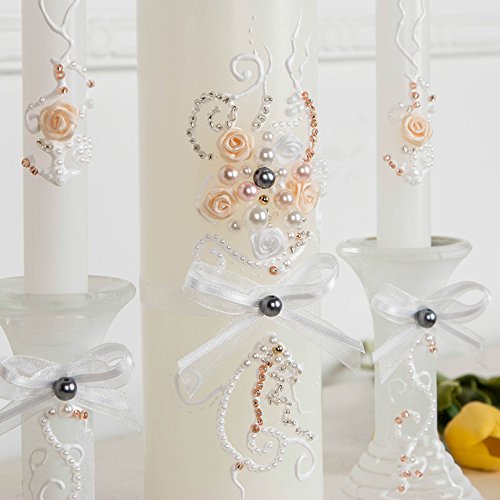 - Unique and elegant Wedding Unity Candle set, hand decorated with fabric roses, bows and pearls. Colors are Mother of pearl and white. It will make a great addition to your wedding reception. Also it's a PERFECT bridal shower gift! This listing is for 3 candles: 2 taper candles 1 pillar candle and 2 Glass Candleholders *** Center pillar candle 70x225mm (2.8x8.9in) 0753FE
