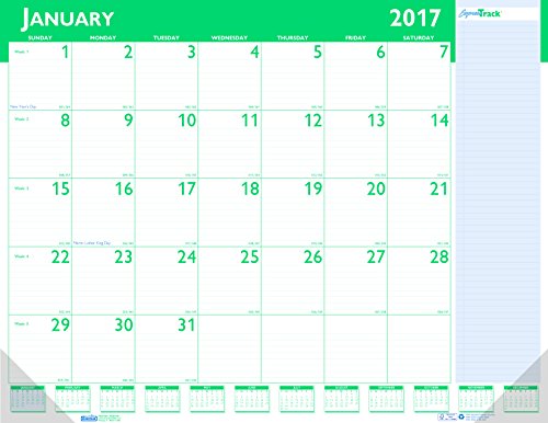 -. Feature : January 2017 - January 2018, featuring 13 months for Easy planning / Full monthly view on each page, featuring 2.5" x 2.75" blocks allocated for each day. Large space for notes on the right side of every page / Calendar pages are gummed glue at the top with two clear corner protectors at the bottom / Includes Julian dates and days remaining with a full year reference calendar on each page / P.R.Inted with high quality soy-based inks on 100% post-consumer recycled paper which is FSC certified and made in the USA