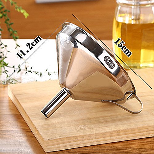 -. Feature : Funnel, very convenient and practical, when water poured into the bottle, do not worry about the hot hand or spill. / Can also be used to the kitchen filling oil, irrigation shower gel, liquid detergent and so on. / It can also be used in the kitchen soy sauce, cooking wine, cooking oil and other. / Filling with hanging hole for easy storage, especially designed. / Stainless steel funnels ideal for filling small bottles and containers. Hand washing recommended.
