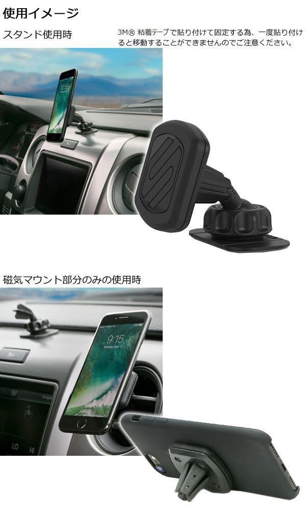 | 付属のメタルプレートをデバイスに直接貼り付けるか、ケースの内側か外側に貼り付けて使用します。スタンド部分は平面部分に3M粘着シートで貼り付けて固定します。磁器マウント部分を取り外して、カーエアコンのはね部分にはさんだり簡易スタンドとしての使用もできます。 |