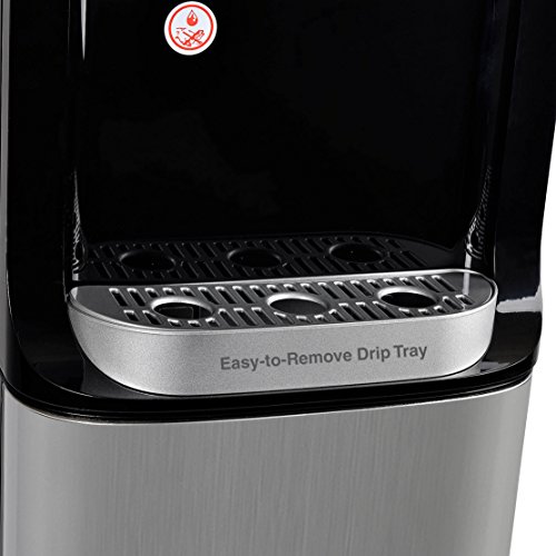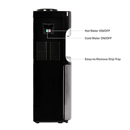 This water cooler dispenser loads from the top & allows you to spot if the dispenser is running out of water, which is a great feature for office settings