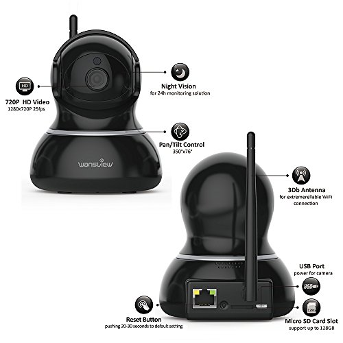 Why you should trust our 720p Pan/Tilt Wireless IP Camera: Stunning HD 720P (1280*720) video at 25fps. Videos and photos can be recorded and playback via local micro SD card( storage up to 128GB ,usually for continuously about 6 days recording) as well as your mobile phone 3 Dbi Antenna for extremely reliable Wifi connection Smart pan tilt and 4x digital zoom with wide-angle for complete coverage Remarkable two-way audio, talk and listen via mobile App is convenient Night vision up to 20 feet distance, living stream can be seen even in the dark Supports viewing on web browsers (IE, Firefox, Chrome),phone and tablet. Supports ONVIF 2.0 to 2.5 and compatible with Blue iris or iSpy etc Package list: Wansview Camera