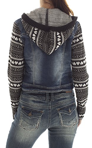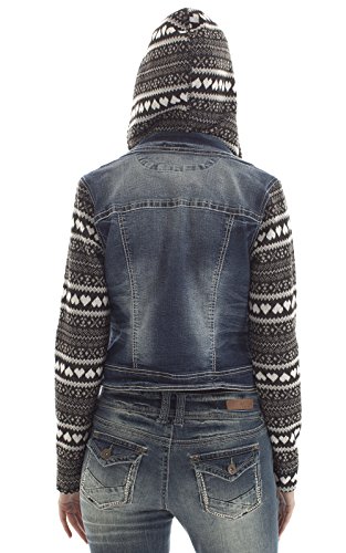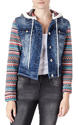 Soft knit printed sleeves and hood give this denim jacket a fun finish. Button placket. Long sleeves.