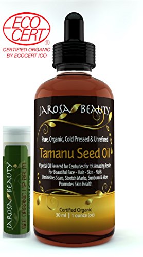 -. Feature : Restore, revitalize and rejuvenate dull lifeless skin, hair and nails the way nature intended. Nourish your skin to fight signs of aging with this super-nourishing and replenishing oil. / Is your hair, skin, or nails dull and lifeless? Are acne or other scars red and noticeable? Tamanu seed oil has been known to bring life and a glow to the skin, reducing and fading the darkness and redness of acne and other scars, deeply moisturizing the skin, hair and nails and providing anti-aging benefits. It has also been known to fight acne and fade acne scars by promoting the growth of healthy skin for a youthful glow. / Tamanu seed oil in it's natural, unrefined state has antimicrobial, antibacterial, and anti-fungal qualities that nourishes and feeds the skin. This essential oil fights dryness, acne (ideal for teenager acne), aging, discoloration, scarring and promotes healing. This Cold pressed and unrefined tamanu seed oil retains the characteristic scent of the tamanu nut. The natural goodness of the oil has been retained by not filtering the oil and leaving it in its natural state, for maximum benefits. / Jarosa Beauty's Tamanu Seed oils are Certified Organic, By Eco Cert ICO with their seal. Don't add chemicals and pesticides to your skin, thereby causing more damage, by using a product that is not certified organic. If the product does not have a seal from an organic certifier on the bottle, it is not organic. Know that you are getting organic by getting your oil from a trusted source. With thousands of happy customers, Jarosa Beauty is a name you can trust. / When you purchase today for a limited time, get our customer favorite Jarosa Beauty's Bee Organic Peppermint Lip Balm with every bottle purchased, a $6.99 value. Simply scroll to the top of the screen and click the add to cart button to be sure to get this special offer today.