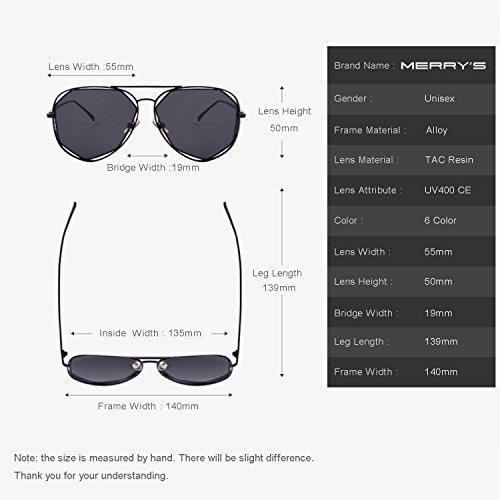 -. Feature : MIRROR LENS - 100% UV400 Protection Lens,Blocks 100% Harmful UVA,UVB & UVC Rays / STYLE-2016 Newest Brand Design,It is Suitable For Any Face, Show Your Unique And Fashion. / Suitable- Shopping,Party,Houseboat,Or Other Outdoor Activities Enthusiasts. / Lens Height:50MM(1.97 Inches)--Lens Width:55MM(2.19 Inches)--Temple Length--139MM(5.83Inches)--Nose Bridge:19MM(0.63Inches)--Frame Length 140MM(5.58 Inches) / 30 DAY MONEY BACK GUARANTEE - All MERRY'S customers enjoy 30 Day Money Back Guarantee. Customers can return and get refunded in case the purchasing is not satisfactory for any reason. You have no risk to try and we will provide you the best service!