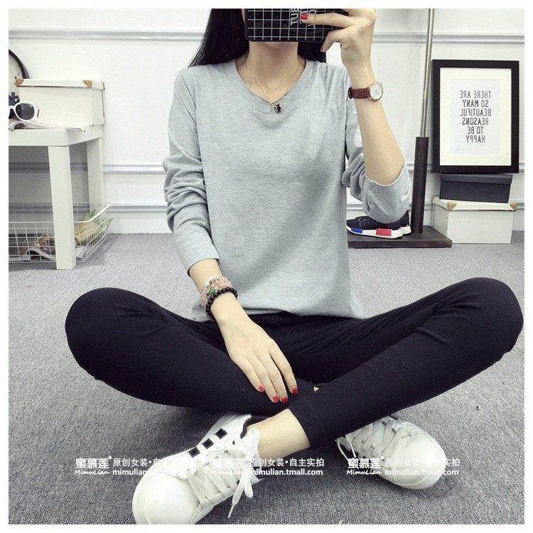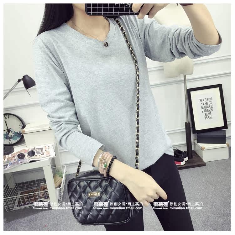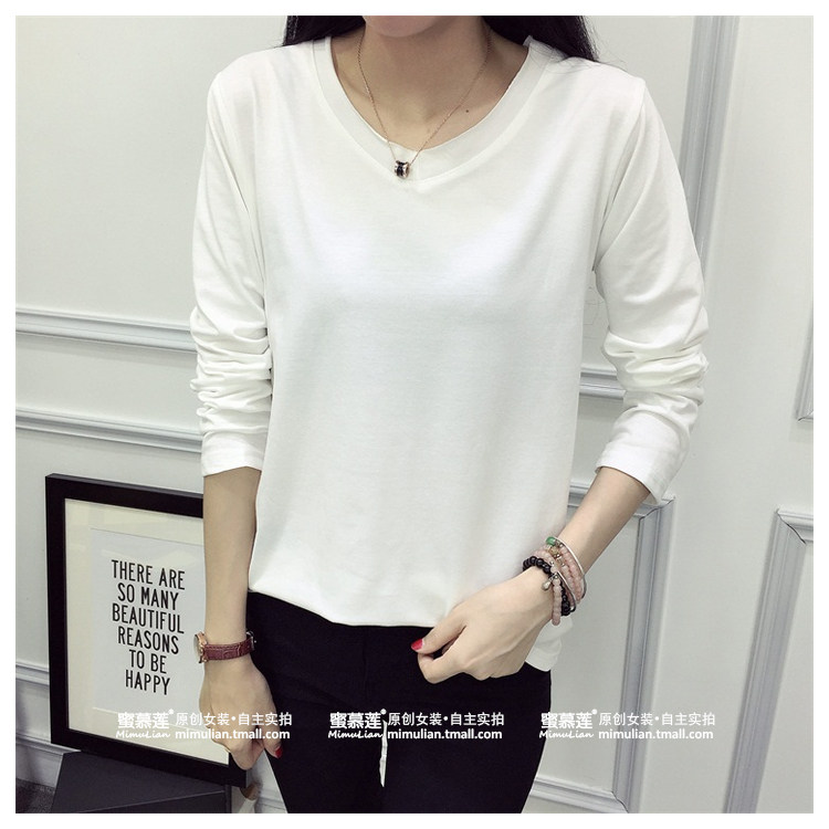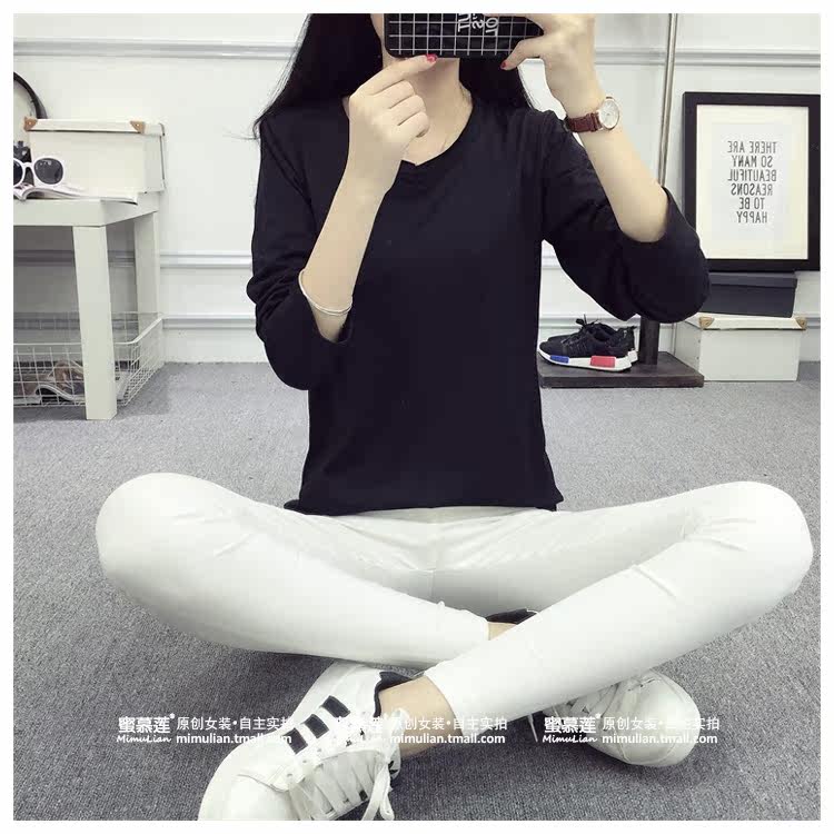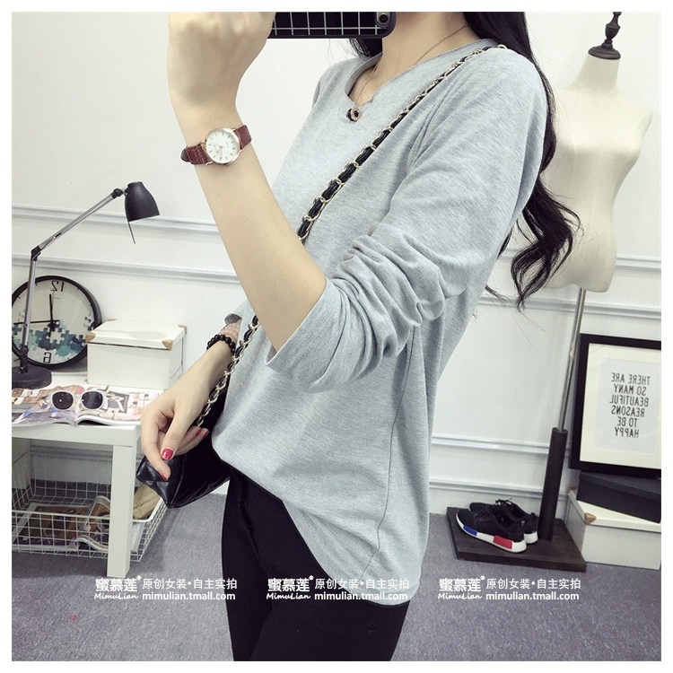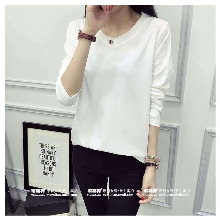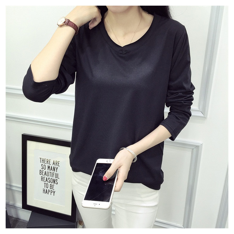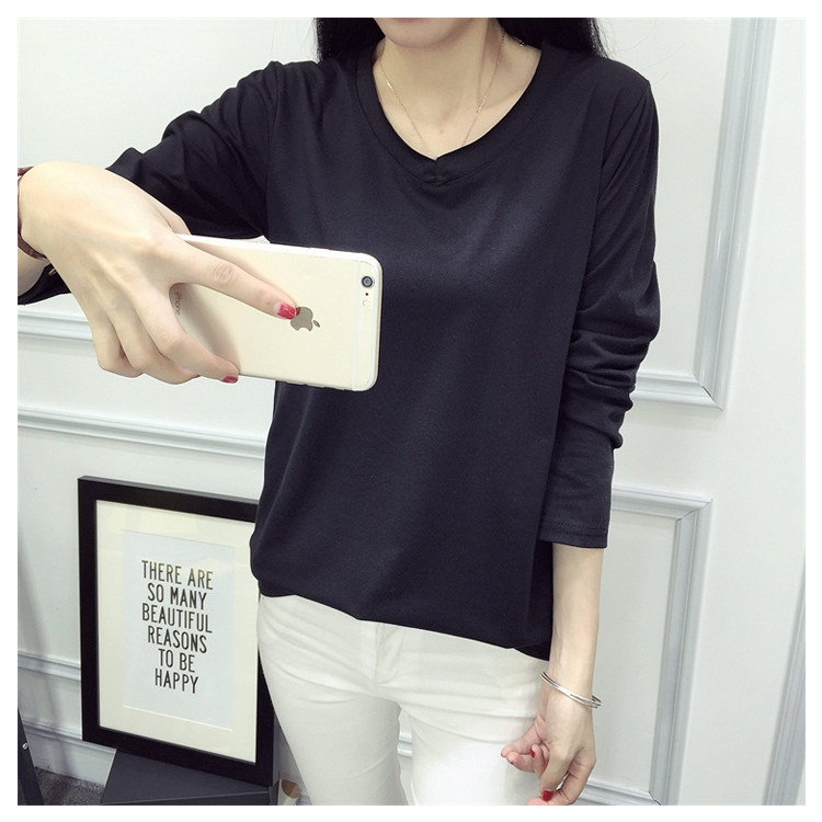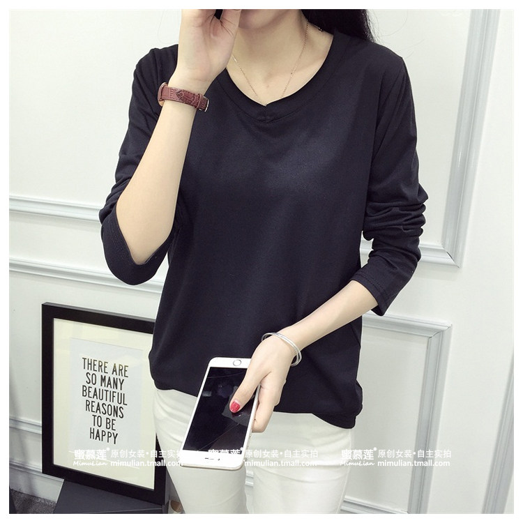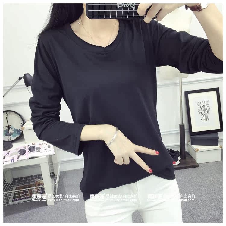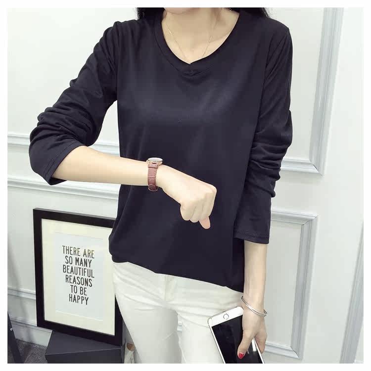 T恤女长袖学生V领纯色棉打底衫韩版大码宽松显瘦百搭上衣秋冬装潮