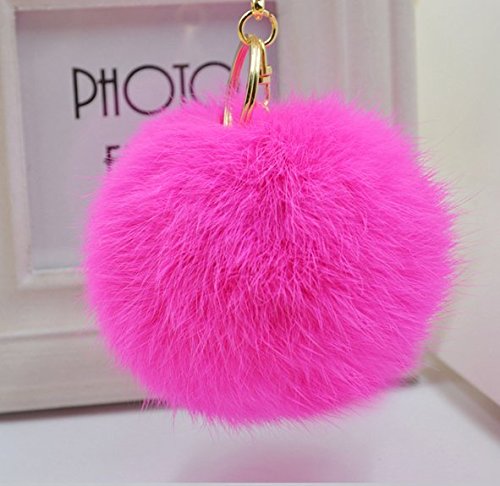 Minigianni 3.5 Inches Rose Red Big Fluffy Rabbit Fur Pom Pom Charm Ball with Key Ring Chain Keychain - Pendant for Handbag Wallet Purse Car Key(Rose)
