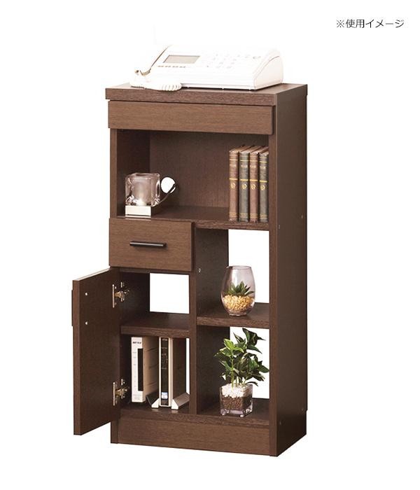 | 上部引出はA4書類が収納でき、天板奥はコードを通すスペース、背面下部に巾木よけ(約H8cm)があります。下部は背板のないオープン仕様ですので、光電話の機器やルーターを収納したときに配線がスムーズです。 |