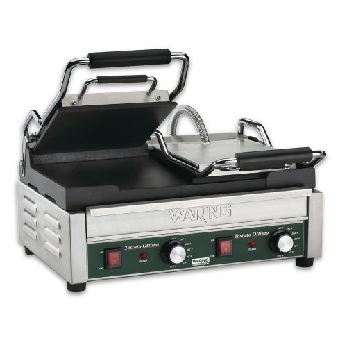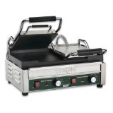 Warring Commercial Dual Flat Panini Grill with Timer 240 volt. This is a heavy duty commercial Panini grill with flat plates both top and bottom. It is designed to be run on and run all day. The cast iron is extremely durable and has very little recovery time when cooking.Feature