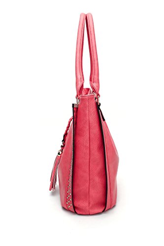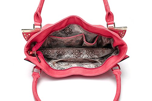 Exterior features back zippered pocket, braided tassel, gold tone studs and rhinestones